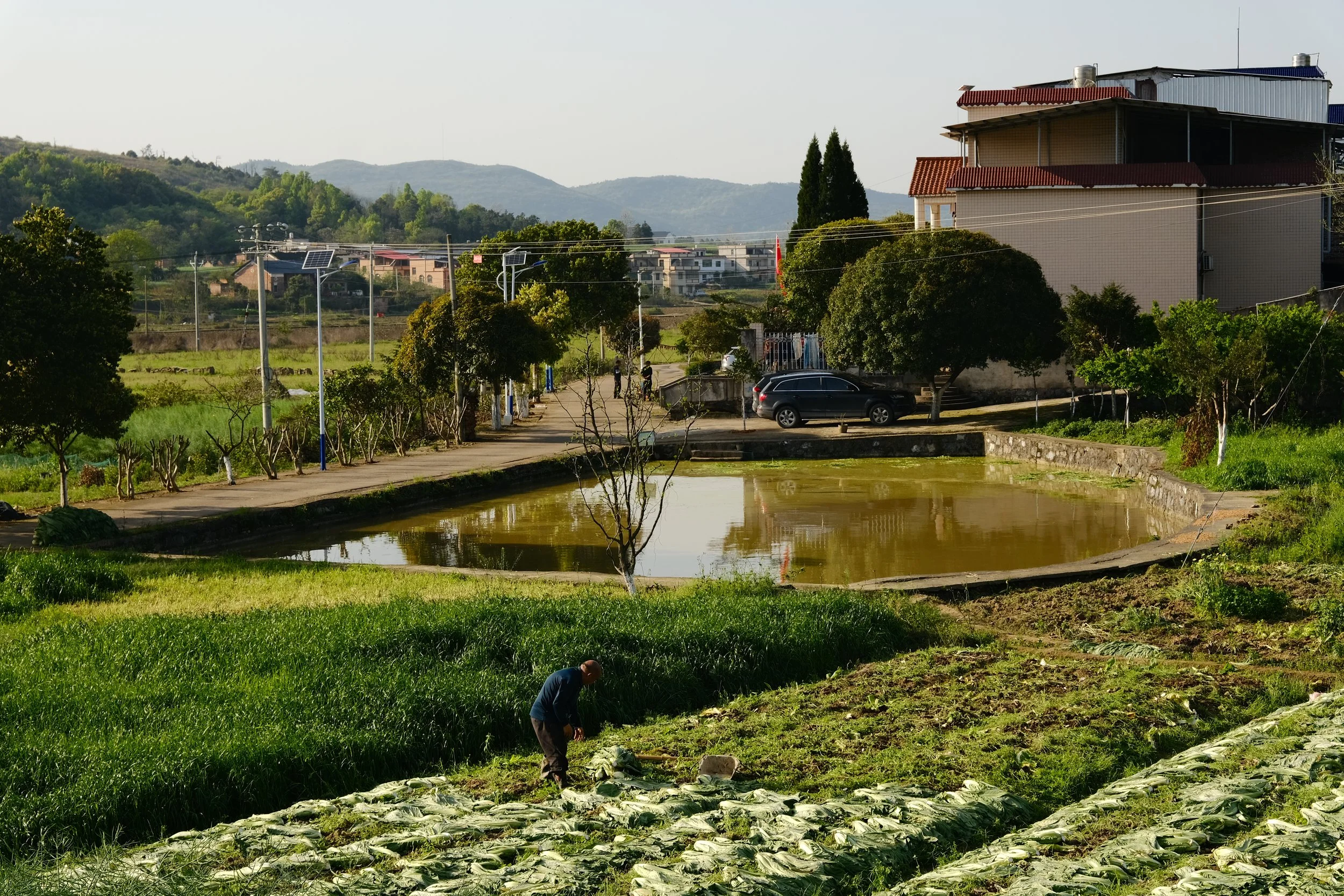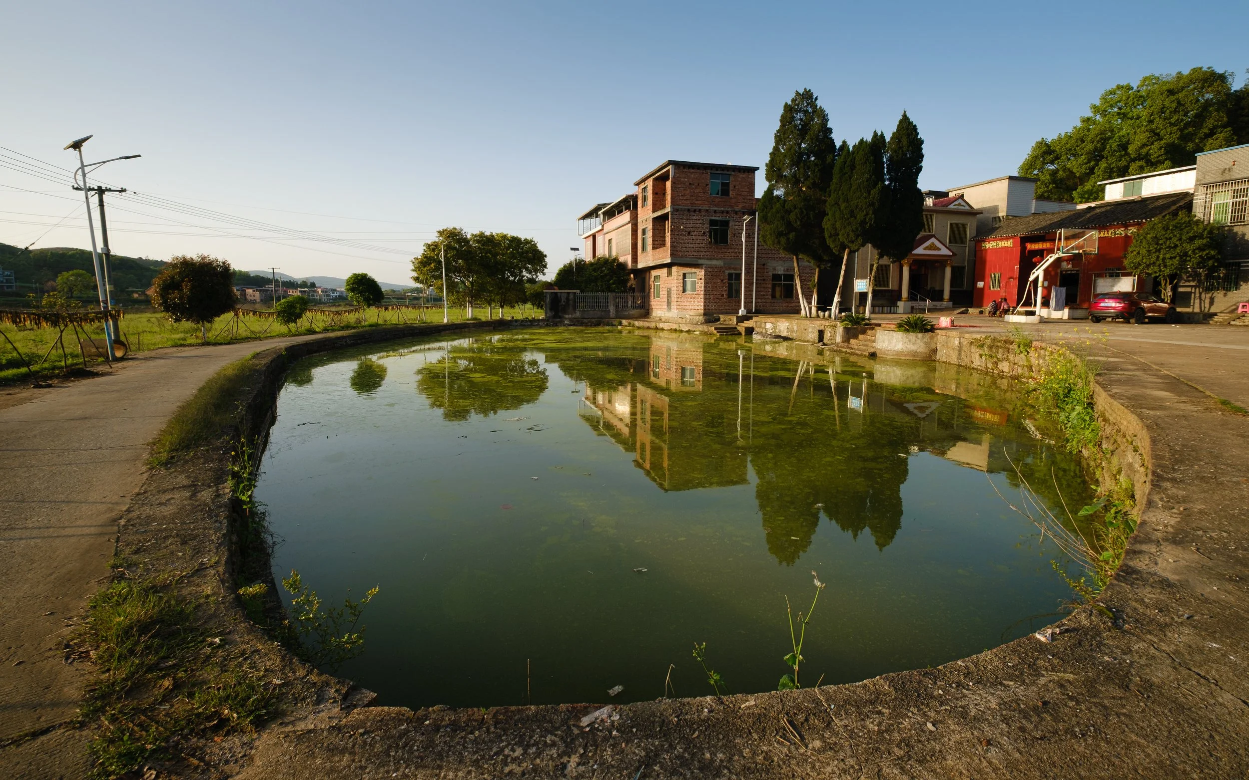 房子很朴素,有的仍是红砖砌就,样式几十年未变。有的中庭向天敞开,有的因岁月与风雨而微微倾斜。村与村之间,狭窄的碎石路在农田与鱼塘的拼贴间蜿蜒,平静的水面倒映着远处的山影。