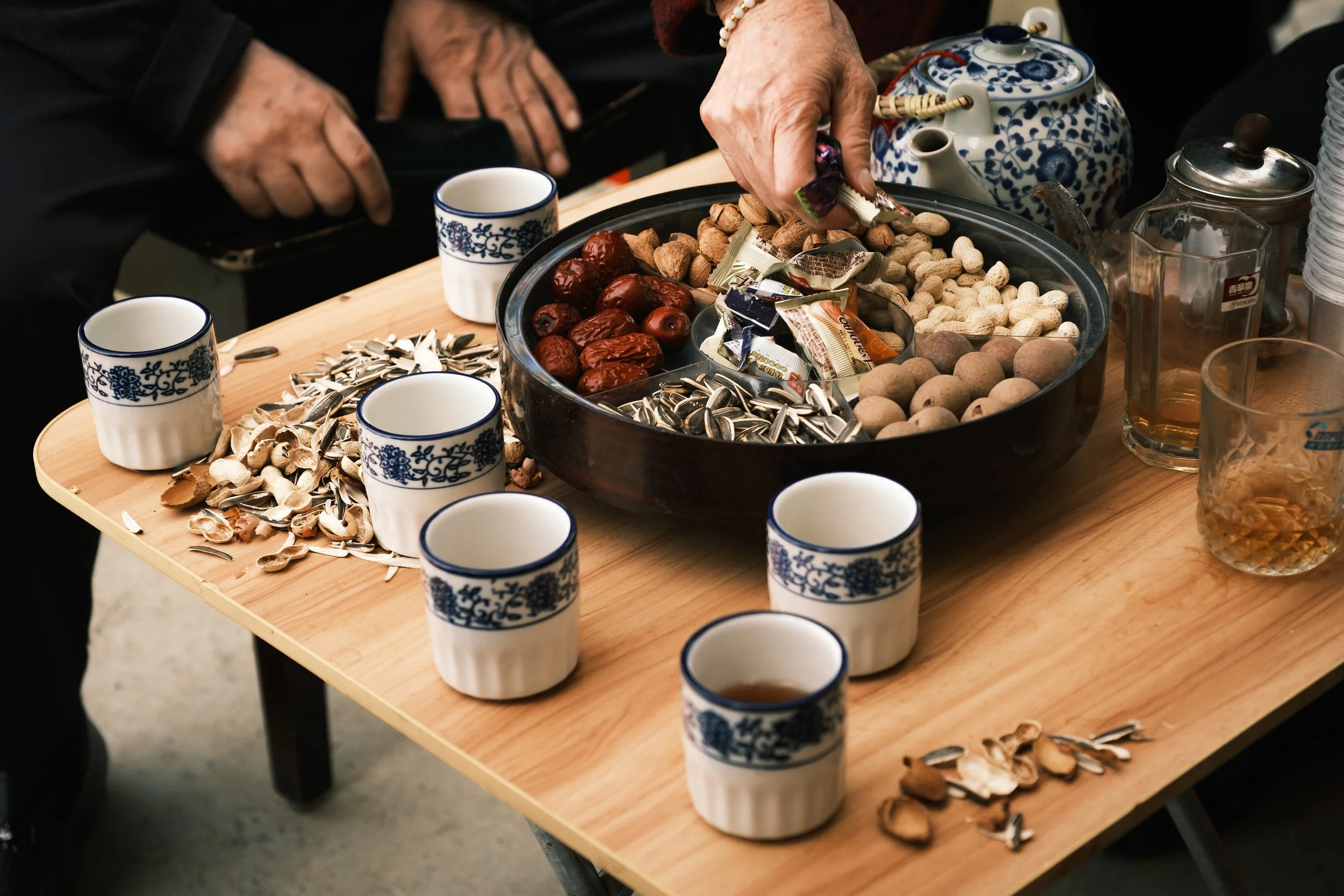 Their house was simple: tile floor, wooden furniture, a TV playing something they weren’t watching. They poured tea, the good kind, very fragrant, and brought out snacks: Preserved plums, sunflower seeds, peanuts, candies for the kids.
